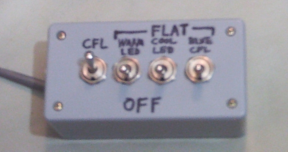 The page author had the good luck to find another used light bar with 6 sockets, so he built the color-blindness simulator. He used a switchbox (below) and an 8-conductor cable between the switchbox and the lamp. Colored LED bulbs were used.